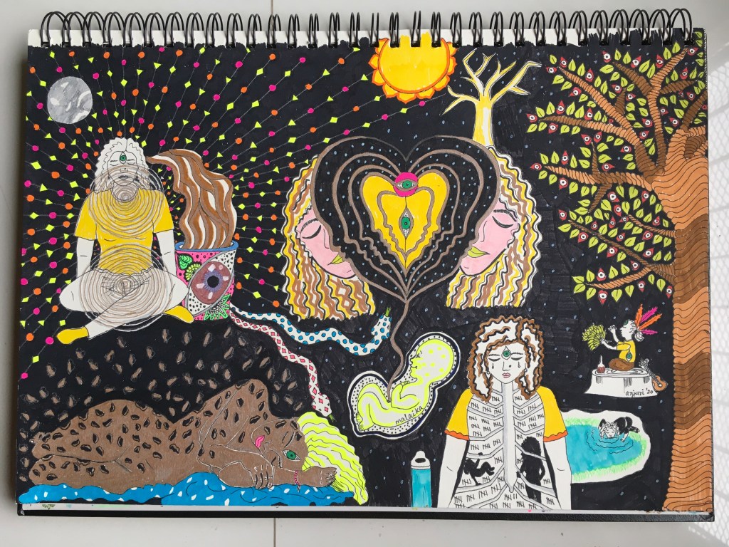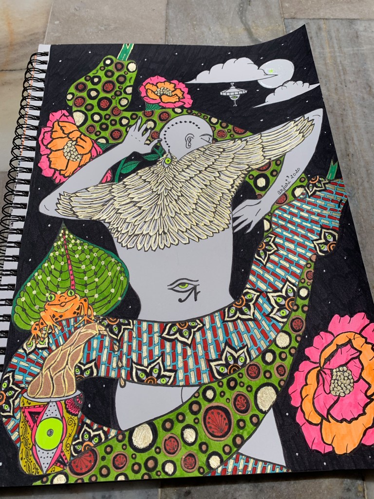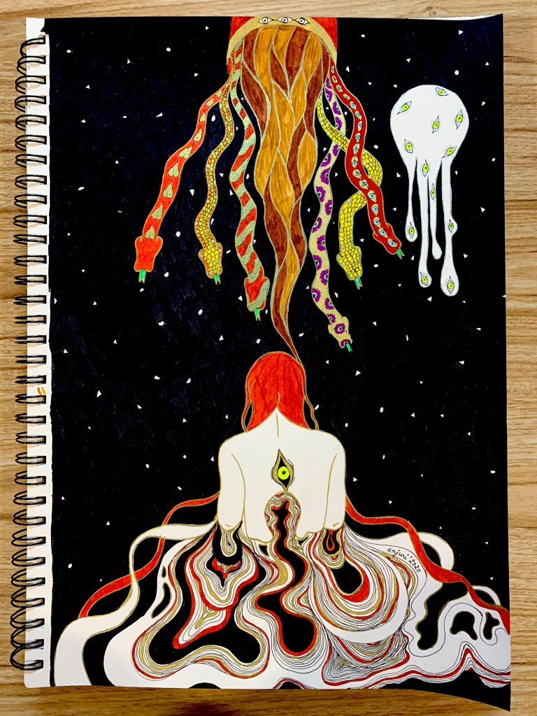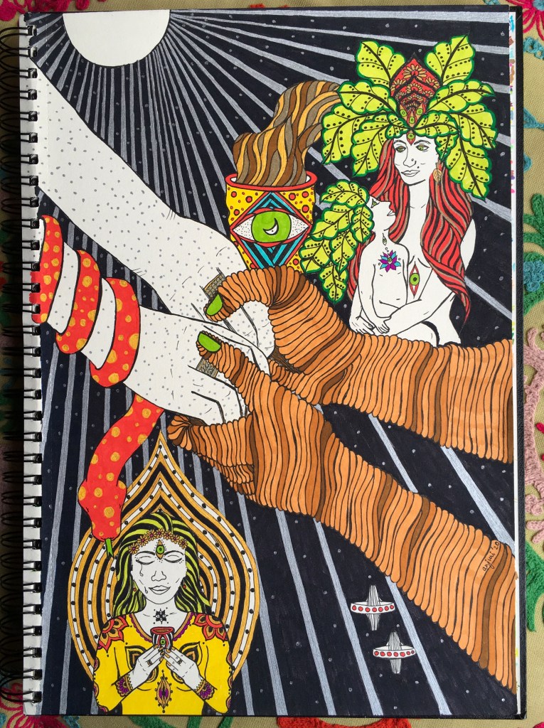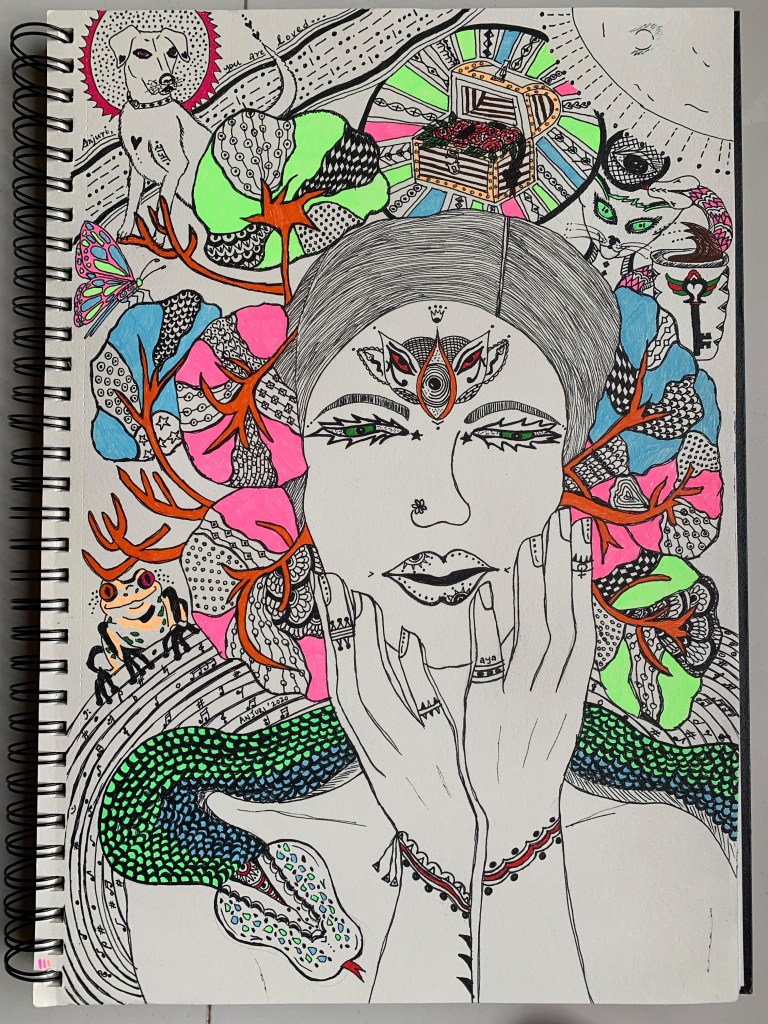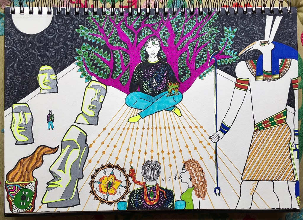 On April 12th, 2020, I drew my first ever Ayahuasca-inspired drawing. A sort of rendition of what I sense the Mother to be like, surrounded by elements of her Creation, in my life experience.