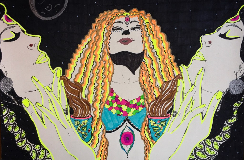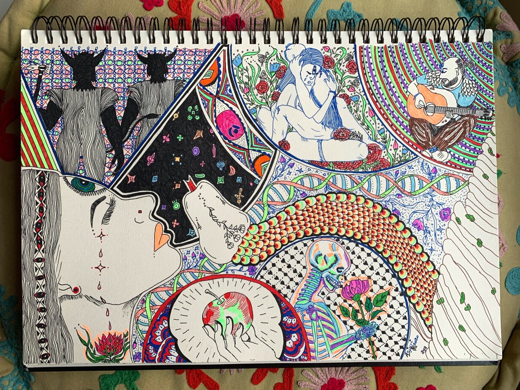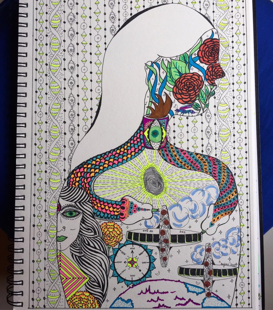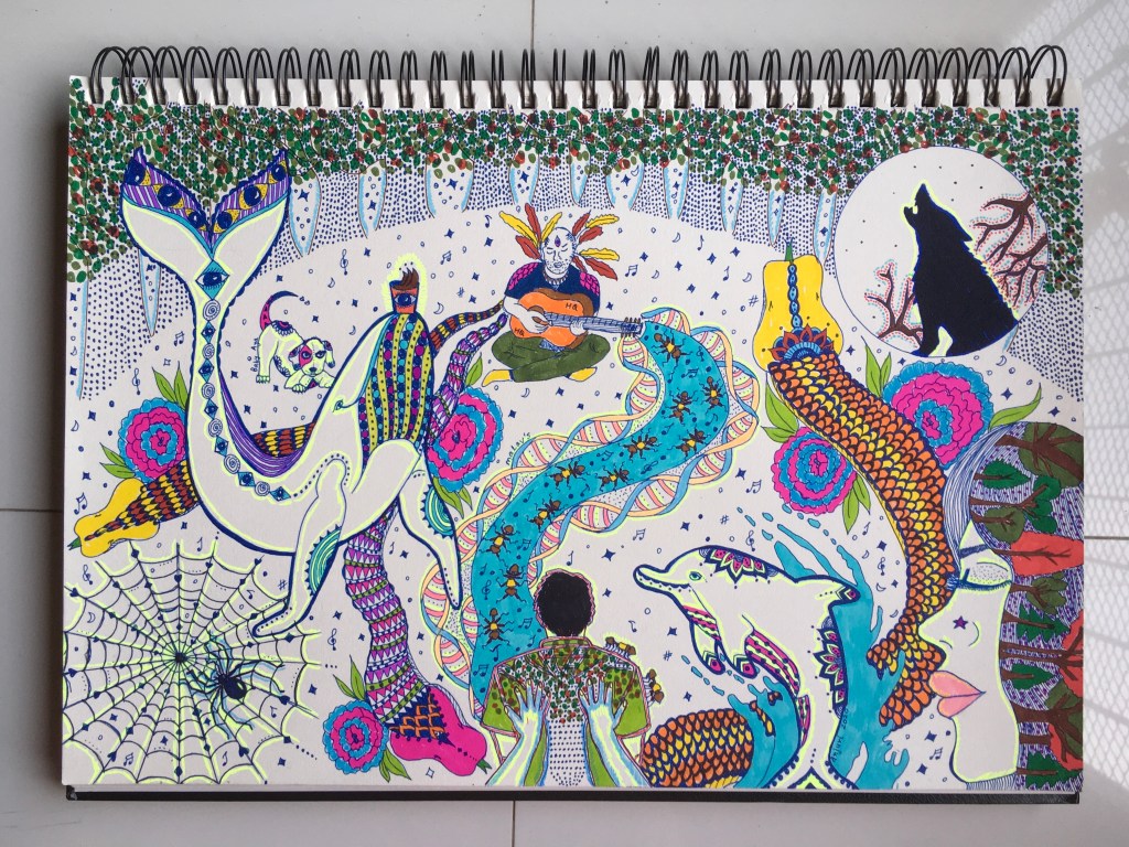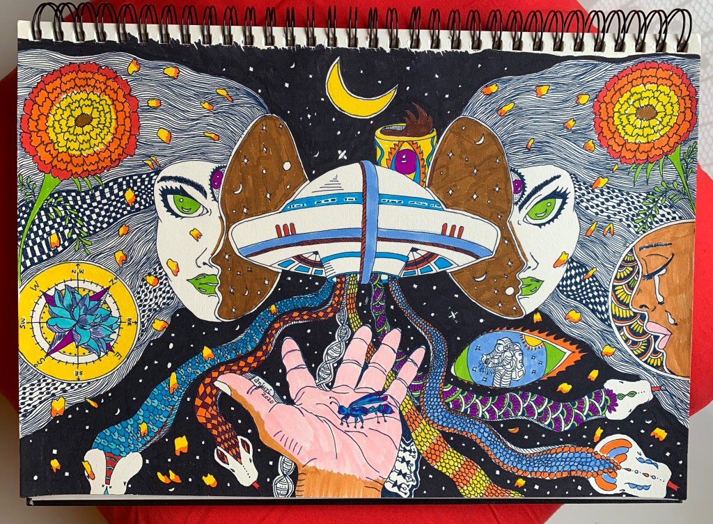 On April 12th, 2020, I drew my first ever Ayahuasca-inspired drawing. A sort of rendition of what I sense the Mother to be like, surrounded by elements of her Creation, in my life experience.